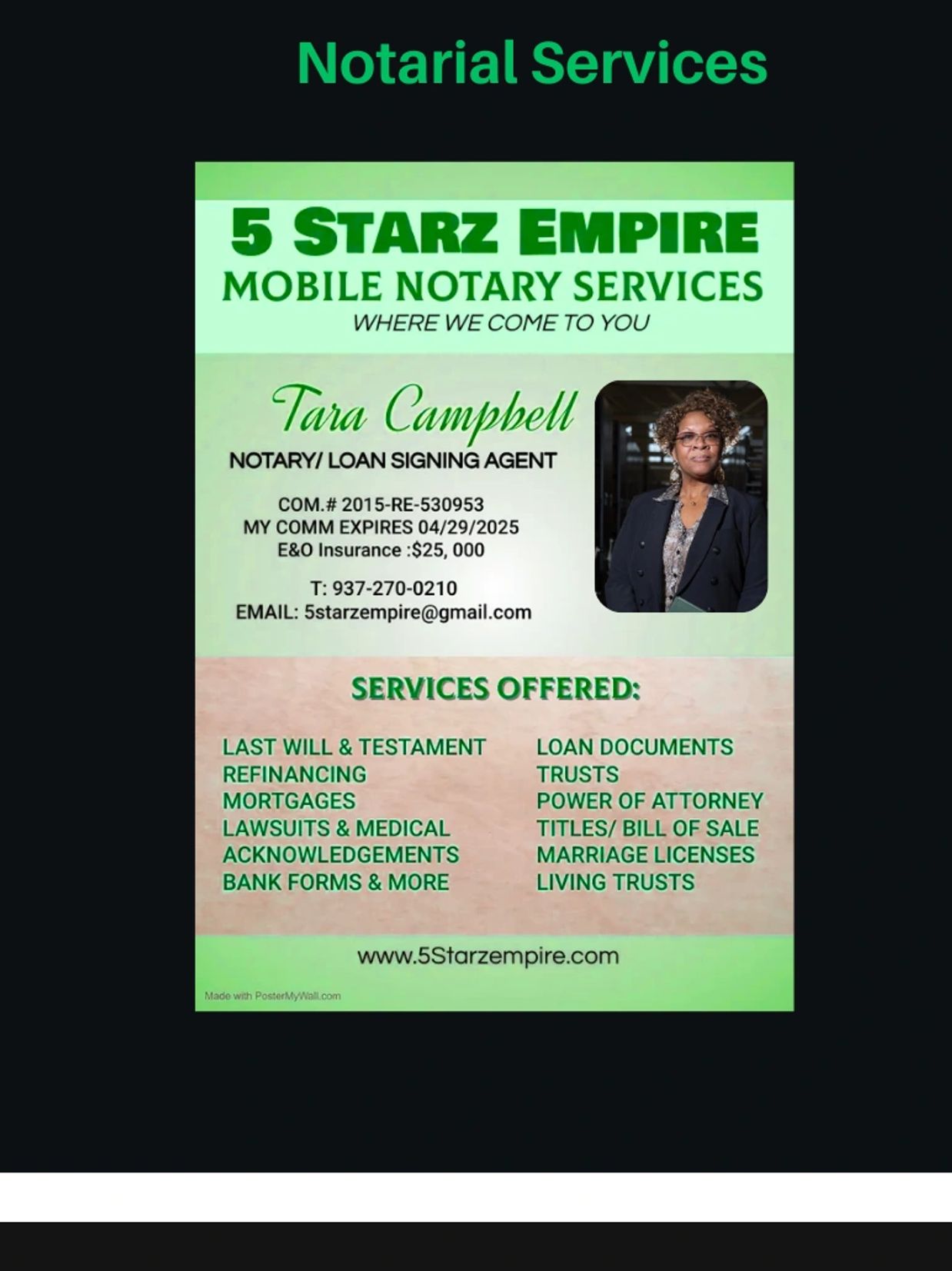 5 Starz Empire LLC provides professional, accurate, and convenient notarial services designed to meet the needs of individuals, businesses, and organizations. Our goal is to deliver timely, detail-oriented support with the highest level of integrity and confidentiality, giving every client true peace of mind.